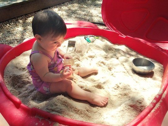 Let baby explore his or her artistic side safely, with some edible paint outside.